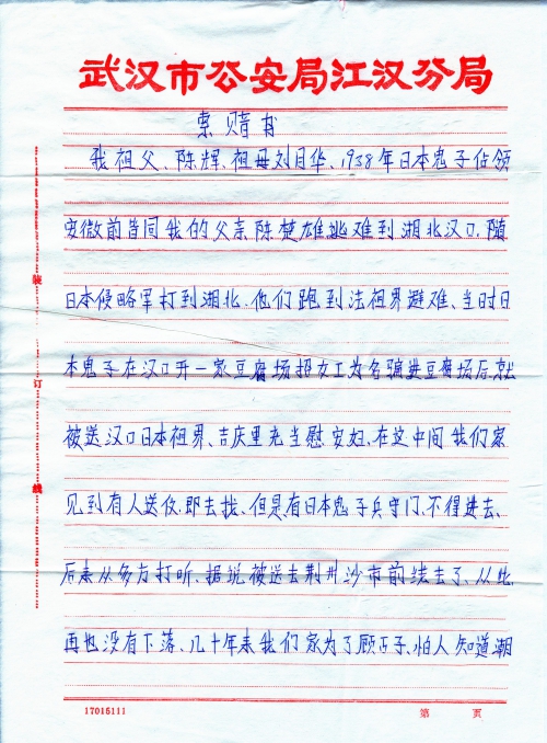 My grandfather Chen Hui, grandmother Liu Yuehua, took my father Chen Cuxiong to flee to Hankou, Hubei, before the Japanese invaders occupied Anhui in 1938, when the Japanese Invasion Army entered Hubei, they ran to the French Settlement to seek protection, back then the Japanese invaders pretended to recruit female workers for a tofu workshop in Hankou, after workers were recruited they were sent to the Japanese settlement in Hankou to work as comfort women in Jiqingli, in the process our family saw someone delivered message, we then went there to find out the truth, but the Japanese soldiers stood guard at the gate, and we were unable to get in. Later we made query from many sources, it was rumored they were sent to frontline at Shashi in Jingzhou, and ever since then there was no news about the whereabouts. Over the past several dozen years our family never said anything about it, out of consideration for face, and afraid of being laughed at if others knew the matter, there’s nowhere to express our sorrow and bitterness. Now we read an article on newspaper saying there’s a tide of private claims, it was then that we knew Lecturer Tong Zeng was helping us Chinese victims to redress grievances, aiming to demand justice from the Japanese government, and obtain compensation for victims across the nation during the Anti-Japanese War, Today we also learned the Japanese government has conceded wrongdoing for its war actions in the first half of this month, which provided mental comfort for the victims, we hereby lodge a claim.