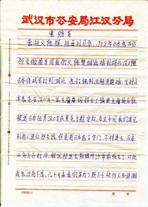 In 1938, my grandfather Mr. Chen and grandmother Mrs. Liu escaped to Hanzou, Hubei with my father before Anhui was occupied by the Japanese army. Later, as the Japanese army invaded Hubei, they escaped to the French Concession (the area of Shanghai once designated for the French) for shelter. At that time, the Japanese army established a tofu factory at Hanzou to deceive women into working for it and then send them to the Jiqing Avenue at Hankou of the Japanese Concession to be comfort women (women and girls forced into sexual slavery by the Imperial Japanese Army before and during World War II). During that period, my family received a letter and tried to look for her, but the Japanese soldiers guarding the gate didn’t let them in. Later they made inquiries and were told that she was sent to the frontline in Jinzhousha. After that, they lost her whereabouts. For decades, to save face and avoid being laughed at by people, my family never told others about our sorrow. Recently, we’ve seen an article on the newspaper about claiming for civilian compensation and known that you are helping Chinese victims of the Anti-Japanese War claim for compensation against the Japanese government. Moreover, I’ve heard that the Japanese government has apologized for their acts during the war earlier this month, which is a spiritual comfort to our ancestor. I hereby submit a letter of claim for compensation.