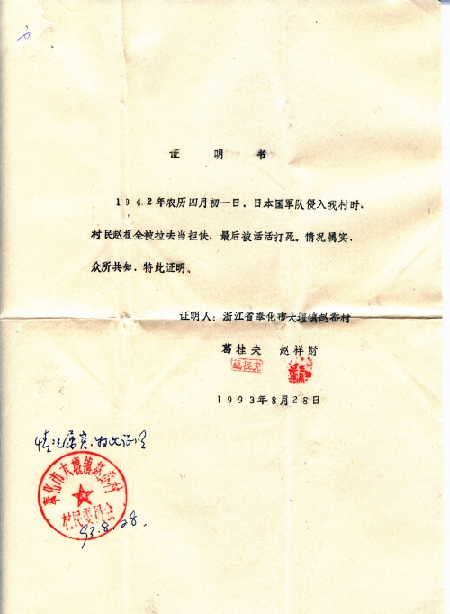 1942年农历四月初一日。日本军队侵入我村时,村民赵根全被拉去当担夫,最后被活活打死,情况属实,众所共知。特此证明。