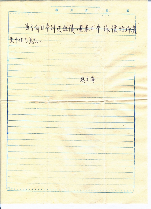 为了向日本讨还血债,要求日本诉偿经济损失十伍万美元。