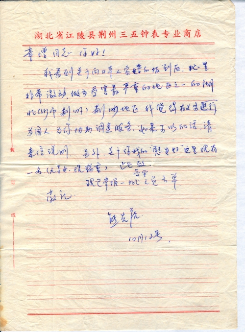 我看到关于向日本人索赔的报[道]后,心里非常激动,[作]为受害最严重的地区之一的湖北(沙市荆州)荆州地区,我觉得有义务为国人、为你协助调查服务,如果可以的话,请来信说明。另外,关于你找的“慰安妇”这里现有一名。(无子女,现病重)