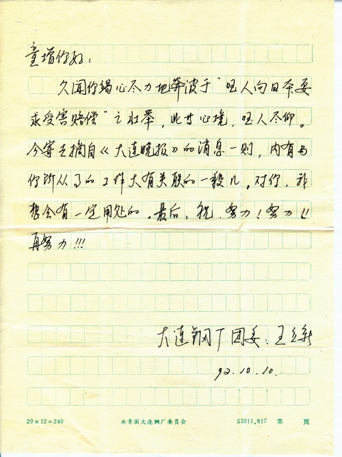 久闻你竭心尽力地奔波于“国人向日本要求受害赔偿”的壮举,此等心境,国人尽仰。今寄去摘自《大连晚报》的消息一则,内有与你所从了的工作大有关联的一段儿,对你,我想会有一定用处的。最后,祝,努力!努力!!再努力!!