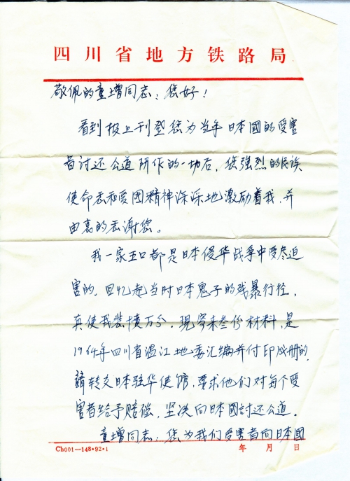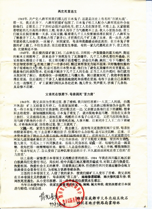 My 5-member family suffered a lot from the war. It really hurts to recall the atrocities of the Japanese army. I am sending three pieces of material that were compiled and printed by the Party Committee of Wenjiang, Sichuan Province in 1964. Please forward them to the Japanese embassy in China and firmly demand justice and compensation for each victim from China.