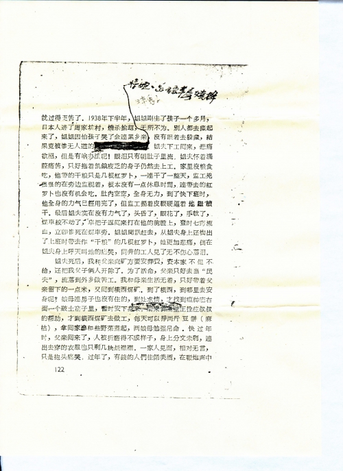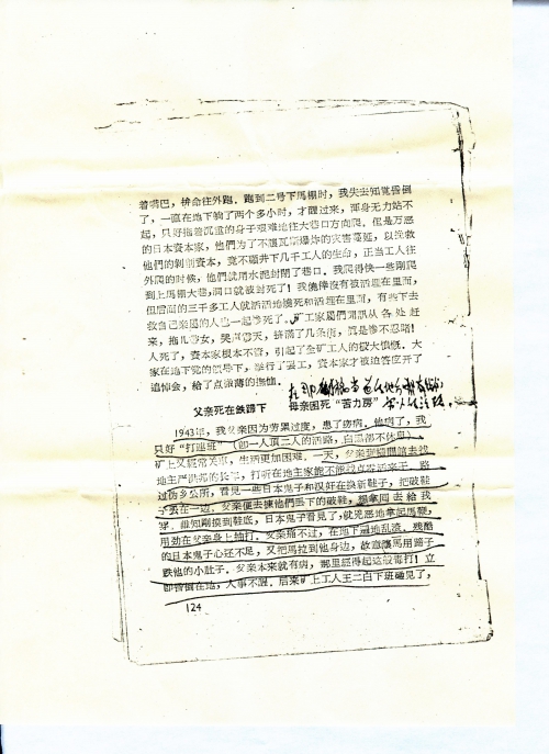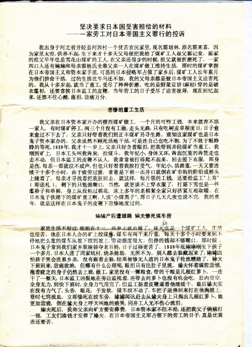 The vicious Japanese imperialists invaded my hometown and made mine workers like me suffer greatly. My father died in the hands of Japanese imperialists, my mother was tortured to death in the Laborer House, my sister was tragically raped, my brother-in-law died miserably near a coal cart and I myself had two narrow escapes and suffered a lot since I was little. I will never forget these debts.