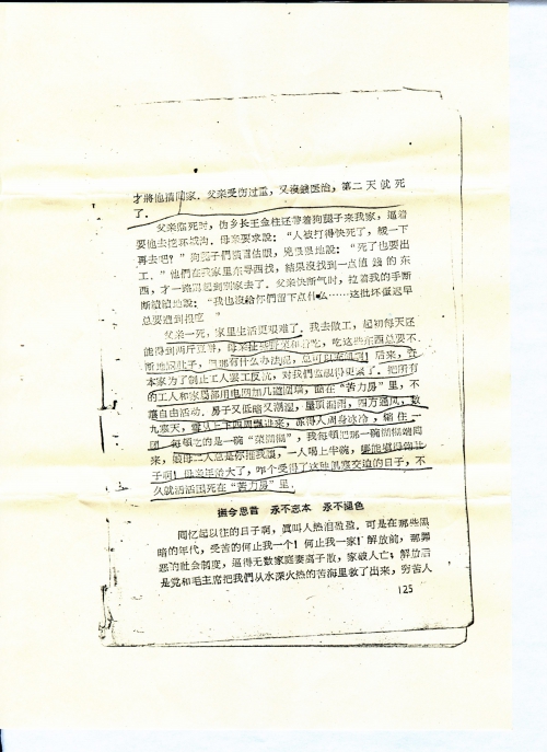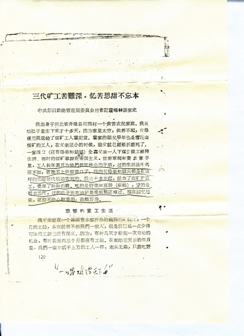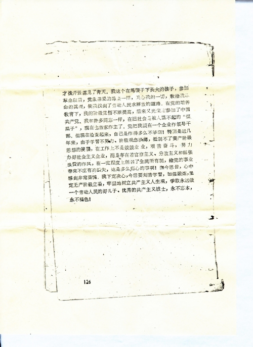 Recalling the memories always fills me with tears. But in the dark age, not just me or my family suffered. Before the People’s Liberation, the evil social system tore numerous families apart and caused them homeless. It wasn’t until the People’s Liberation that the Communist Party and Chairman Mao saved us from the miserable life and we poor people began a new life. I grew up under horse whips, but after I joined the revolution, the Party cared about me like a loving mother, taught me the truth of revolution, and helped me on the way towards the People’s Liberation. With the training and education of the Party, my class consciousness improved constantly. Later, I honorably joined the Communist Party of China. Like many comrades, I was a mine worker looked down upon by others in the old society, but now I become the owner of my own life. The Party even appoints me as a leader of a company. When I examine myself, I realize I have so much to do! Especially in recent years, instead of studying hard, having a strong sense of class, resisting the invasion of bourgeois ideology, working conscientiously and hard, and endeavoring to build a good socialist company, I have adopted a certain bureaucratic, decentralized and extravagant style and have undermined the ownership by the whole people to some extent, causing unnecessary losses to the Party’s cause. It really breaks my heart! I feel rather ashamed when reflecting on the past, so I am determined to study hard, actively exercise, take a firm proletarian stance, resolutely establish the communist outlook on life and make efforts to always be a good son of the working people and an outstanding communist fighter who never forgets his origins and never changes who he is!