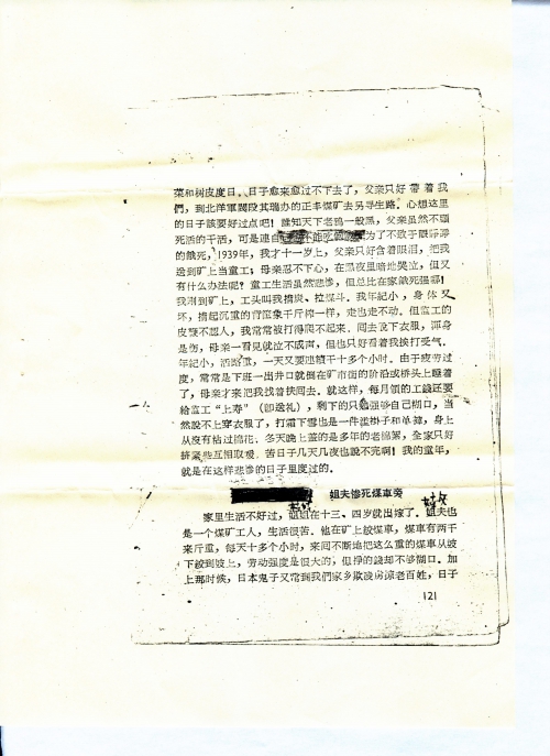 My father worked in Hengxi Coal Mine run by a Japanese capitalist and was paid too little to support my whole family. Sometimes the mine would be shut down and my father would have no work to do for 2 or 3 months. We had no choice but eat tree barks and grass roots. Life couldn’t go on like this. So my father took us along and found a job in Zhengfeng Mine to make a living. Unexpectedly, it was also run by a Japanese capitalist! Even though my father worked desperately, he couldn’t earn enough food for himself. To prevent my family from waiting for death, my father, with tears in his eyes, had to bring me to Jingxing Coal Mine to be a child laborer in 1939 when I was only 11 years old. Just after I joined the mine, I was ordered by a Japanese foreman to carry coal and pull coal buckets. I was too young and too weak to walk while carrying the heavy basket, but the whips of the Japanese foremen equally fell on all laborers. I often had difficulty getting up after being whipped to the ground. After I returned home and took off clothes, my bruises all over the body made my mother cry, but she couldn’t do anything about it. Due to a young age and heavy work for over 10 hours straight in a day, I was so exhausted that I often fell asleep on the stairs in the Kuangshi street or under the bridge as soon as I got off work. Then, my mother would search for me and carry me back. Even so, our monthly wages, except a “gift” (bribery) to the foremen, could barely support our family, let alone buy new clothes. We wore ragged coats and thin clothes even in cold winter and never had any cotton on us. The whole family shared the many-year-old cotton quilt for warmth. The suffering of child laborers working in a coal mine run by the Japanese couldn’t be fully described in days. I spent my miserable childhood under the whip of the Japanese.