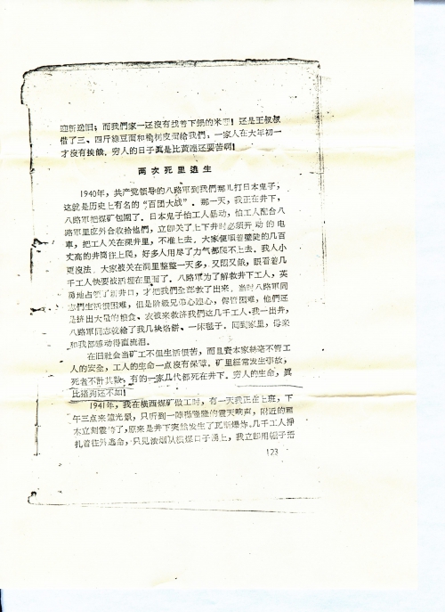 In 1940, the Communist Eighth Route Army fought the historically famous battle- the Hundred–Regiment Campaign-with the Japanese army in my hometown. On that day when I was working down the mine, the Eighth Route Army suddenly surrounded the mine. The Japanese were afraid that the workers might cooperate with the Eighth Route Army to fight them, so they shut down the tram that must be used to get up or down the mine to keep the workers down in the deep mine. The adults tried to climb up the several-hundred-meter-high wall, but in vain, let alone me who was much younger. We were left in the mine for more than one day, suffocated and starved. Seeing that thousands of workers were to be buried alive in the mine, the Eighth Route Army bravely took control of a new exit and saved us all. As soon as I got out of the mine, the comrades with the Eighth Route Army gave me several pancakes and a quilt. When I brought them home, my mother and I were so moved that we cried. Apart from a difficult life, accidents often happened in a mine run by the Japanese. I knew that some family members of several generations died under the mine. The life of slave laborers was indeed more worthless than animals.