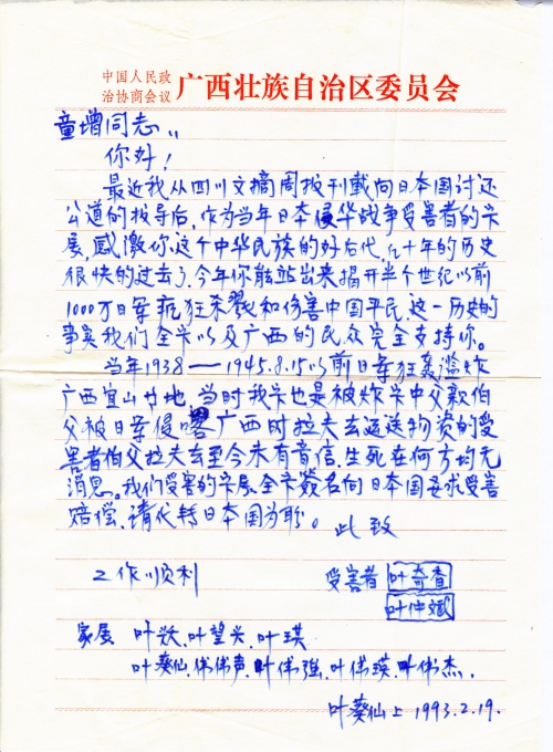 最近我从四川文摘周报刊载向日本国讨还公道的报道后,作为当年日本侵华战争受害者的家属,感激你这个中华名族的好后代,几十年的历史很快的过去了。今年你能站出来揭开半个世纪以前1000万日军疯狂杀戮和伤害中国平民。这一历史的事实我们全家以及广西的民众完全支持你。