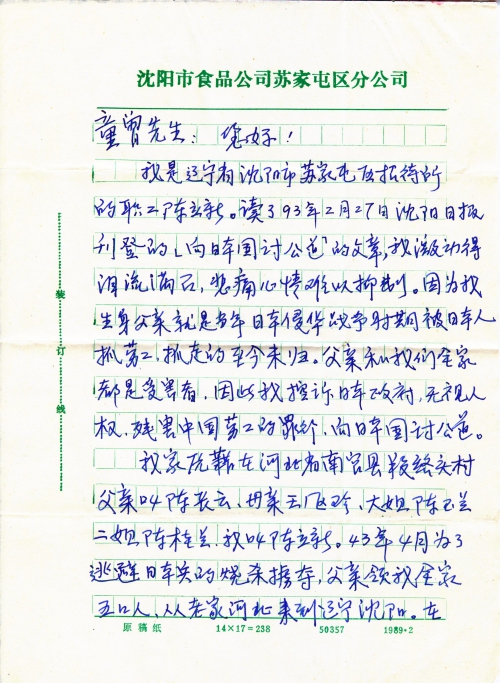 我是辽宁省沈阳市苏家屯区招待所的职工陈立新。读了93年2月27日沈阳日报刊登的「向日本国讨公道」的文章,我激动得泪流满面,悲痛心情难以抑制。因为我生身父亲就是当年日本侵华战争时期被日本人抓劳工抓走的,至今未归。父亲和我们全家都是受害者,因此我控诉日本政府,无视人权,残害中国劳工的罪行,向日本国讨公道。