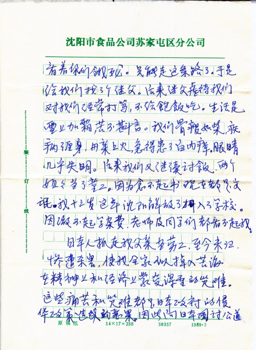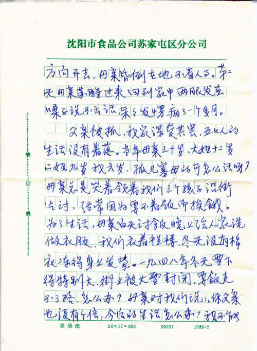 父亲被抓,我家深受其害,五口人的生活没有着落。当年母亲三十岁,大姐十二岁,二姐九岁,我六岁,孤儿寡母的可怎么活呀?母亲总是哭着领着我们三个孩子沿街乞讨,经常因为要不着饭而挨饿。为了生活,母亲白天讨饭晚上给人家洗做衣服,我们衣着褴褛,冬天没有棉衣,冻得身上发紫。一九四八年冬天雪下得特别大,街上被大雪封闭,要饭走不了路,怎么办?母亲对我们说:「你父亲也没有个信,今后的生活怎么办?我不能看着你们饿死」。只能走这条路了,于是给我们找了个继父。后来继父虐待我们,对我们经常打骂,不给饱饭吃。生活是雪上加霜,苦不堪言。我们骨瘦如柴,疾病缠身,母亲上火,急得患了白内障,眼睛几乎失明。后来我们又继续讨饭,两个姐姐当了童工。因为念不起书,现在都是文[盲]。我十三岁这年沈阳解放了才入了学校。因缴不起学杂费,老师及同学们都看不起我。