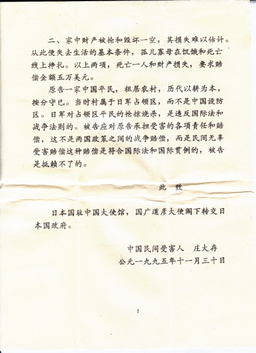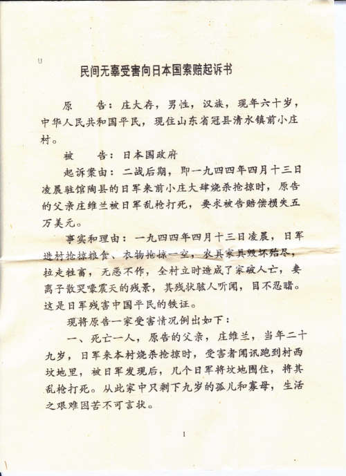 民间无辜受害向日本国索赔起诉书
