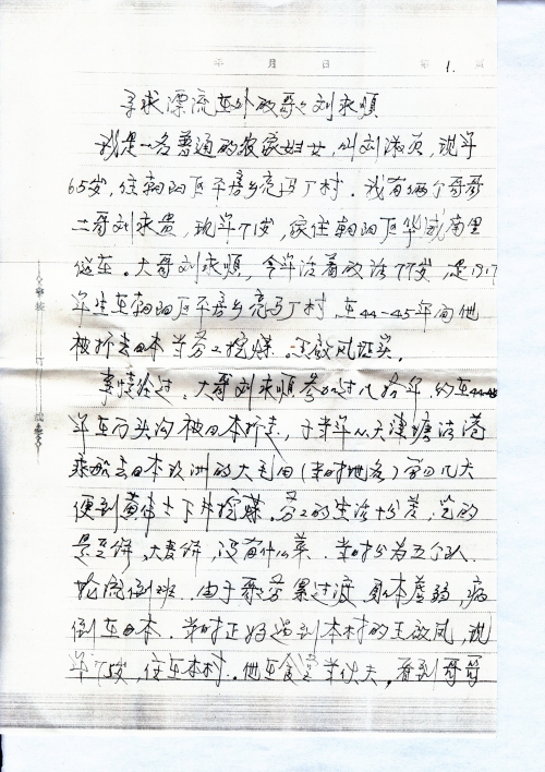 我是一名普通的农家妇女,叫刘淑贞,现年65岁,住朝阳区平房乡亮马厂村。我有俩个哥哥,二哥刘永贵,现年71岁,家住朝阳区华威南里,健在。大哥刘永顺,今年活着是话77岁,是1917年生在朝阳平房乡亮马厂村,在44-45年向他被抓去日本当务工挖煤。王啟凤证实。