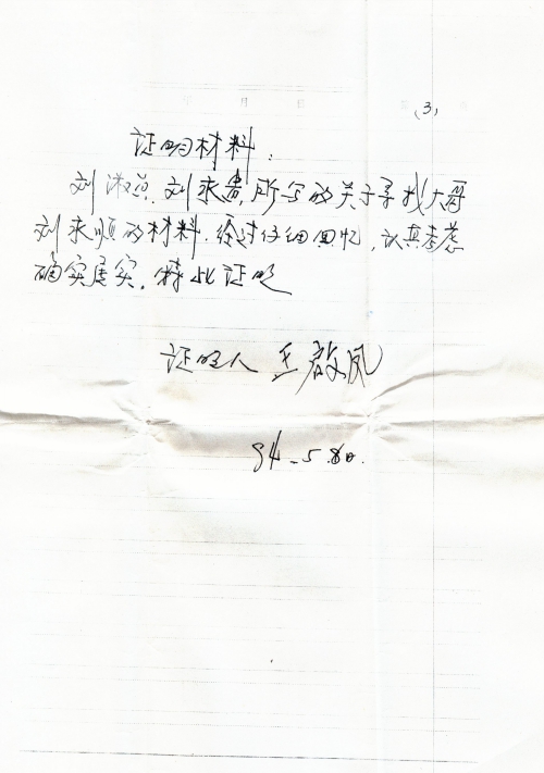 刘淑贞、刘永贵缩写的有关寻找大哥刘永顺的材料,经过仔细回忆,认真考虑,实确属实。特此证明。