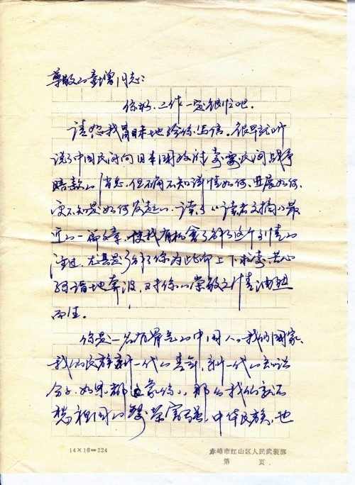 As a youth of the new age, I was promoted to officer rank in the army, and now I work at the Department of the People’s Armed Force. Each time when there’s a national defense education session, I would feel deeply shaken in mental awareness. We should righteously demand war compensation from the Japanese government with self confidence, I sincerely hope that with efforts from you and your comrades, we can accomplish civilian compensation, so as to better let the Japanese authority understand our nation’s old maxim: The remembrance of the past is the teacher of the future.