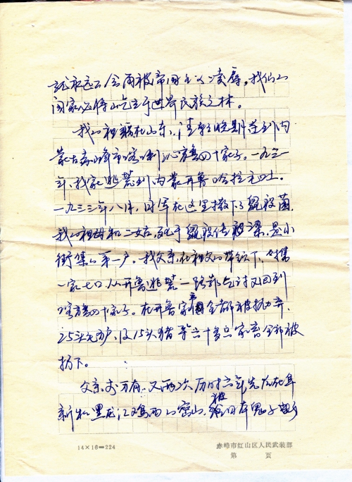 My native place is in Shandong, in the late Qing Dynasty we moved to Sishijiazi, Harqin Banner, Chifeng City in Inner Mongolia. In 1931, my family moved to Halamaodu, Kailu in Inner Mongolia. In August 1933, the Japanese Army spread plague bacteria there, my grandmother and second aunt died of plague infection, the first household in Xiaojieji. Led by my grandfather, my father took seven people of the whole family to leave Kailu and begged our way back to Sishijiazi, Harqin Banner. All our belongings in Kailu were abandoned, more than 60 domesticated animals including 25 donkeys, and 15 pigs were all left behind.