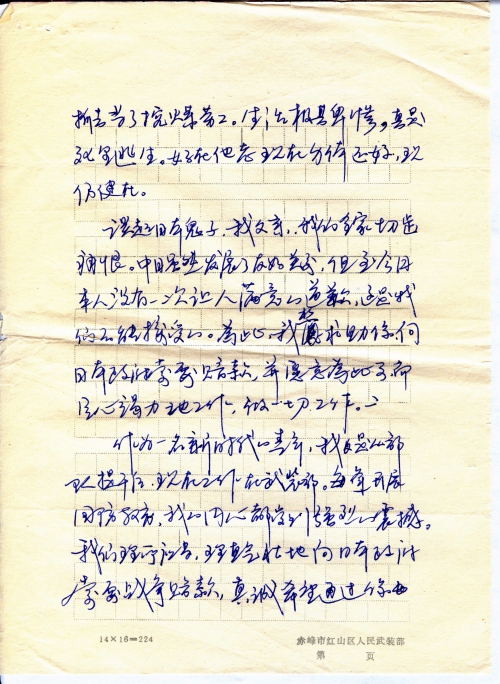 Whenever talking about the Japanese invaders, my father, our whole family would gnash our teeth in hatred. Although China and Japan have established friendly relationship, till today the Japanese had made not even once satisfactory apology, which is unacceptable for us. For this purpose, I want to ask you for help, to demand compensation from the Japanese government, and I’m willing to work whole-heartedly for this matter, I can do anything to help.