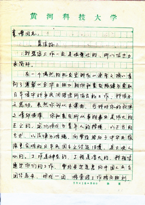 在一个偶然的机会里我在《读者文摘》看到了原载《金华日报》的你和贵友陈健为索取日本侵华战争民间赔偿所做出的工作,我很为之感动,虽然你我从未谋面,可我对你的钦佩之情却很深,你和贵友所从事的事业是伟大的,正义的,您们将成为青年人的楷模,以正当的方式,以法律为准绳,向曾经给加于中华民族深重灾难的日本民国主义讨还旧债,是大快人心的,工作是神圣的,工程是浩大的,我相信通过你们的工作,曾经受过迫害的中国人民会团结起来,抱成一团,将索赔工作推向胜利。我衷心地支持您们,12亿中国人民支持你们,我也相信:明天会更好!