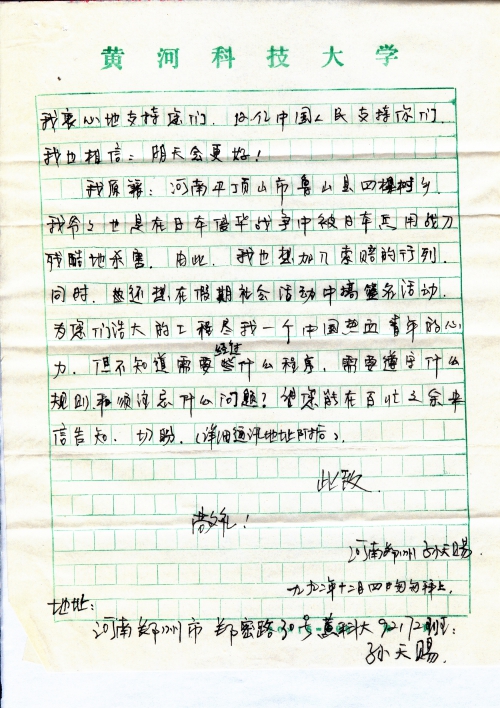 我原籍:河南平顶山市鲁山县四棵树乡,我爷爷也是在日本侵华战争中被日本兵用战刀残酷地杀害,由此,我也想加入索赔的行列。同时,还想在假期社会活动中搞签名活动,为您们浩大的工程尽我一个中国热血青年的心力,但不知道需要经过什么程序,需要遵守什么规则和[需]注意什么问题?望您能在百忙之余来信告知,切盼。(详细通讯地址附后)