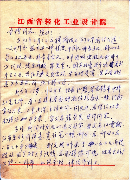 在93年2月3日文摘周报上“向日本国讨公道”一文中得知您在办一件将使中国人伸[张]正义,舒心吐气的正义事业,非常有意义。日本侵略者杀死我成千万同胞,烧杀奸淫,罪恶累累。国家放弃战争赔偿要求本已不当,恐怕是违反民意的。老百姓受害,要求索赔应是正当要求,谢谢您主持公道。