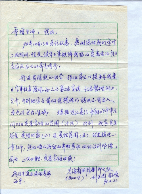 92年12月13日来信收悉,感谢您对我们这些二战期间饱受侵华日军铁蹄践踏的受害者的有力支持及正义的奔走呼号。