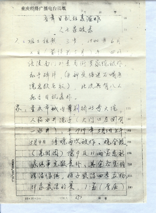 趁返渝探亲的机会,根据家父口授当年[惨]遭日空军狂轰滥炸而人亡家破实情,记录整理附上。文中,个别地方与前向您提供的情况小有出入,本次的更为准确。根据您的复信中(附2)中华民间对日受害索赔的范围(讨论)所列,我家完全符合受理对象(二)及受理范围(五)所述情况。童老师,您的呕心沥血的辛勤劳动必将得到报偿。因为,正义必胜,受害索赔必成!