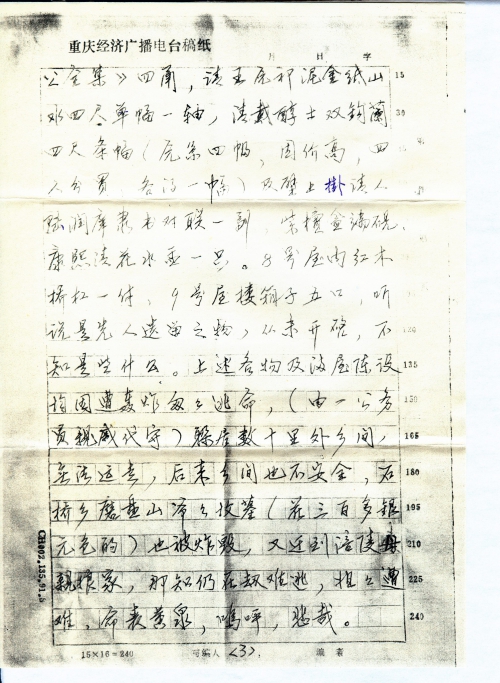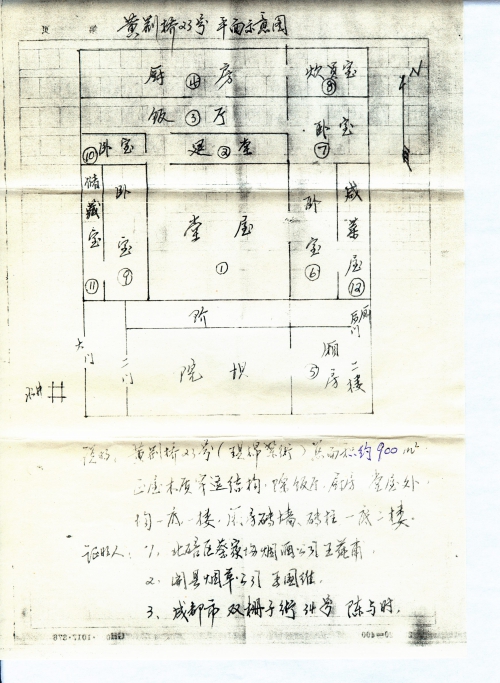 家:重庆市城内黄荆桥23号大院,人称水井院子(大门口左侧有一水井),于1939年5月3日上午、5月4日傍晚两次被炸、烧全毁。(见附图)除9及11两室系新家具事先搬走外,其余各室均摆满家具,柜子装满四季衣物,印象最深的是,1室(堂屋)的全堂汉纹大理石嵌楠木靠背扶手椅八把,大红漆方桌二张,茶几四个,左右两壁清人字画屏对及神龛左侧清人张船山小中堂一幅。6号房楼上箱子八口,其中一口有团绢扇十余把,中有清人恽寿平画的花卉,杨建屏的荷花等。另一口内银质炊锅、汤碗、盏碟,带盂漱口杯等30余件及古铜币(小钱)一串(一千枚)。5号房书柜内,日本精装《支那疆域沿革图》一大本,《十三经》一部,《小仓山房全集》一部,清谭钟狱编绘的《峩山图说》上下册,科试参考用寸大本《赋海大全》十余本,《文献通考》一部,《四库全书总目提要》四甬,《曾文正公全集》四甬,清王原祁泥金纸山水四尺单幅一轴,清戴醇士双钩兰四尺条幅(原系四幅,因价高,四人分买,各得一幅)及壁上挂清人陆润庠隶书对联一幅,紫檀盒端砚,康熙青花水盂一只。8号屋内红木桥杠一付,9号屋楼箱子五口,听说是先人遗留之物,从未开启,不知是些什么。上述各物及满屋陈设均因遭轰炸匆匆逃命(由一公务员亲戚代守),躲居数十里外乡间,无法运走,后来乡间也不安全,石桥乡磨盘山爷爷坟墓(花三百多银元包的)也被炸毁,又迁到涪陵母亲娘家,哪知仍在劫难逃,姐姐遭难,命丧黄泉,呜呼,悲哉。