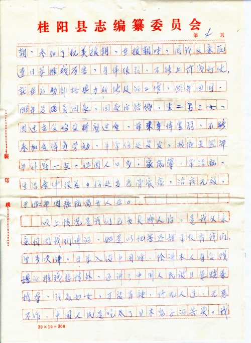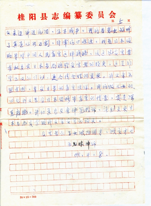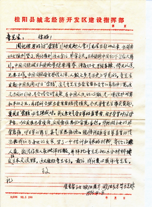 We learned of the above info from my father after we became adults. He educated us with past sufferings to remind us to treasure the good times, and repeatedly mentioned that when the Japanese army invaded China, in addition to his personal torture and persecution, he had also witnessed how the Japanese army burned, killed and looted, raped women. They were ruthless, brutal and inhuman, and absolutely evil. They have inflicted tremendous suffering on the Chinese people. My father would shed tears when talking, and choked with sobs. When we heard his talking, we were devastated as if our hearts were pierced with knifes. In my view, since the Japanese Invasion Army had committed such extreme atrocity toward the Chinese people, these victims are fully entitled to demand the Japanese government to compensate for the victims’ damages. This is an absolutely righteous action and is fully justified. Although my father has passed away, his profound suffering remains to be redressed. As his children, every reminiscence of my father’s suffering in the hands of the Japanese invasion army would conjure intense disgust and bitter hatred. We vow to publicize the grievance and injustice for our father, and strongly demand the current Japanese government to compensate for my father’s damage.