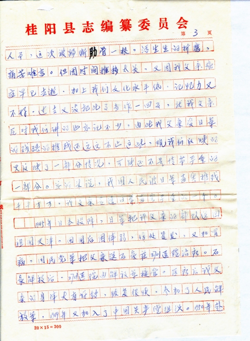 Other details:My father Ouyang Yulan joined in the anti-Japanese war. When the Japanese invaded Luoyang City, Henan Province, aircrafts were sent to bomb the city and my father was captured after being wounded, sent to do labor work and suffered from beatings.