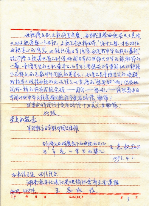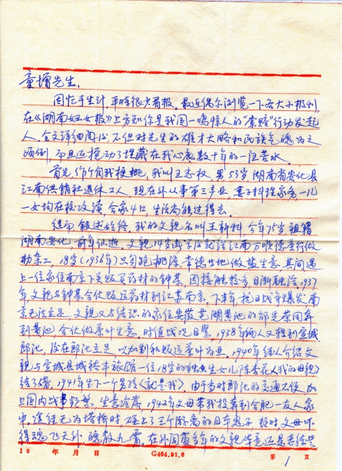 因忙于生计,平时很少看报。最近偶尔浏览一下各大小报刊,在《湖南妇女报》上方知你是我国一鸣惊人的“索赔”行动发起人。全文详细阅读,不但对先生的雄才大略和民族气魄为之[倾]倒,而且还搅动了埋藏在我心底数十年的一汪苦水。