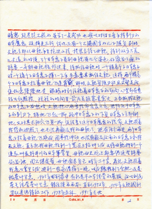 继而,叙述始终,我的父亲名叫王新科,今年75岁,祖籍湖南安化,前年仙逝。父亲14岁断学后就给江南万顺德茶行做勤杂工,18岁(1936年)只身跑桃源、常德等地做盐生意,其间遇上一位家住南京下关贩卖药材的钟某,因接触较多,日渐融洽。1937年,父亲与钟某合伙贩运药材到江苏南京。下半年,抗日战争爆发,南京无法立足,父亲又与结识的家住安徽芜湖黄池的邰先荣同奔到黄池,合伙做茶叶生意。时值战况日紧,1938年俩人又转到宣城郎池,后在郎池立足,以加制和贩运茶叶为业。1940年,经人介绍,父亲与宣城县城裕丰旅馆一位18岁的独生女陈杏花(我的母亲)结了婚。1941年生下一个男孩(就是我),由于当时郎池的交通不便,加上国内战事频繁,生意冷落,1942年父母带我投奔到合肥一友人家中。途经无为塔桥时,碰上了三个游离的日本鬼子,顿时,父母吓得魂飞天外,魄散九霄。在外闯荡多年的父亲毕竟还是老练些。暗想,跑是跑不脱的,虽学了一点武功,也难以对付三条手拣刺刀的日本魔鬼,硬拼更是不行,何况还有一个不满周岁的儿子随身,刹时,父亲立即从母亲手里抱过小孩,提袋交给了母亲。待到双方只差几丈远的时候,3个日本鬼子看到母亲有几分姿色,好像发了疯的野兽,一齐朝母亲猛扑过来,待抓住母亲时,一个稍高个子日本鬼子对一个矮个子日本鬼子挥了一下手,示意要其抓住父亲,这样,两个稍高个子日本鬼子抬着母亲飞速奔跑。那时,父亲身强力壮且又机警灵活,便故意慢慢地走,眼睛时刻注视着日本鬼子的动向,心里却在盘算如何脱险。短短的时间里,最后差距愈来愈大。正当抓我父亲的日本鬼子发怒时,父亲担心两条性命岌岌可危,恐怕死于日本鬼子的刺刀下,猛地飞起一脚,踢中日本鬼子的下身,日本鬼子立即倒地,又对其太阳穴飞身一脚,便结果了这个日本魔鬼的性命。父亲抱着我趁机逃脱了,也无法再顾及我的母亲了。现在话分两头。两个日本鬼子抬着母亲飞跑后,因兽性冲动,也没有顾及后面的日本鬼子和我及父亲,直至把我母亲抬到一个荒地上轮奸之后,又将我母亲押到一个连长叫长野井川的日本军营里。母亲白天晚上都要供这些野兽发泄,因不堪受辱,母亲自杀身亡,时年二十岁。再就,我父亲抱着我虎口余生之后,逃到一农家借宿了一晚,以后辗转到了合肥,还是做茶叶生意。1943年回到家中,起初是干小本经营的茶贩,后以利民茶号经营茶叶生意,销往陕西西安,直到1952年。1954年父亲调到安化县供销社工作,1978年退休,1991年去世。