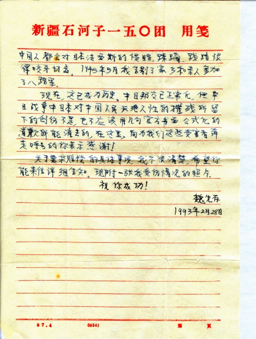 现在,这已成为历史。中日邦交已正常化,但中日战争中日本对中国人民灭绝人性的摧残所留下的创伤不是,也不应该用几句官方书面公式化的道歉所能消去的,在这里,向为我们这些受害者奔走呼号的你表示感谢!