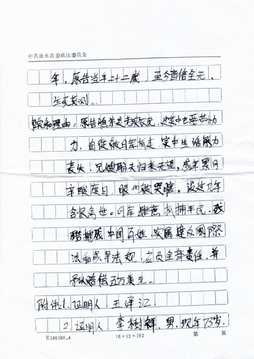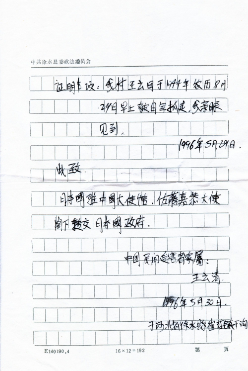 细节:王云清的胞弟王云田在1944年农历8月29日在地干活时候,被日军抓走关押,受尽虐待后无音讯。要求赔偿五万美元。此事有证明人王泽江、李樹祥。备注:信封丢失