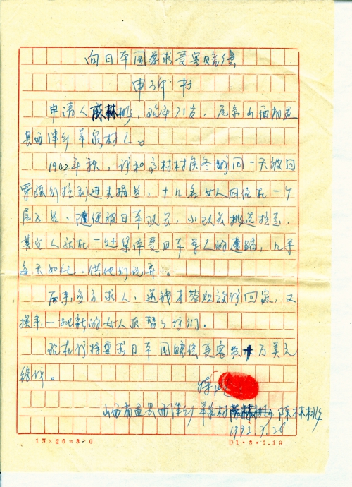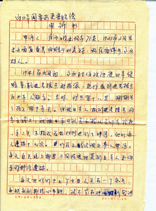 Unfortunately, I was reported by the puppet government for a second time and captured by the Japanese. I was so repeatedly and savagely raped that I couldn’t bear children and had permanent disability. Now, I have a serious disease, cannot move and live on my own depending on government relief. It’s all because of the sin of the Japanese people. I hereby demand a compensation of 120,000 USD to make up for my loss and improve my life.