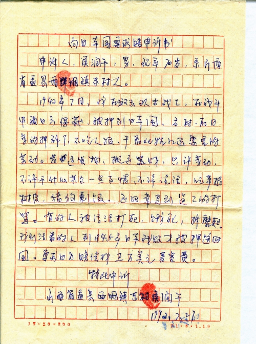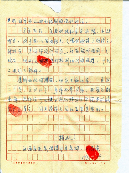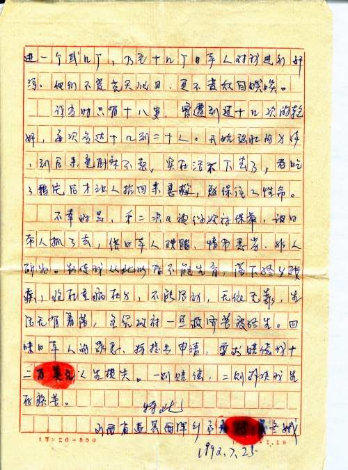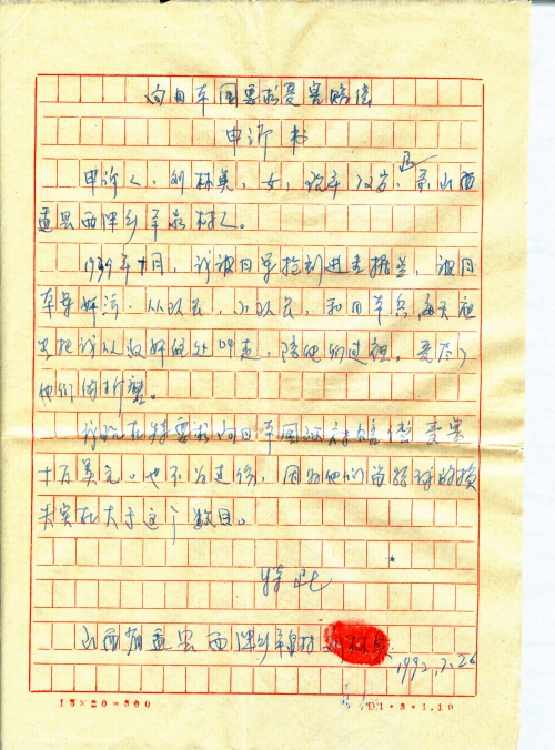 I received your letter on 24th due to the mail delay. I’ve done some work according to your instructions. I’ve collected related materials, including the suffering of six women (Liu XX, Liu YY, Feng XX, Zhang XX, Chen XX from our village and Hou XX from XX Village), who registered at the base. I’ve also collected materials about three men Hou Runwu, Zhao Mei and Li Youfu who were captured and sent to Japan. (Not sure whether this is useful or not)