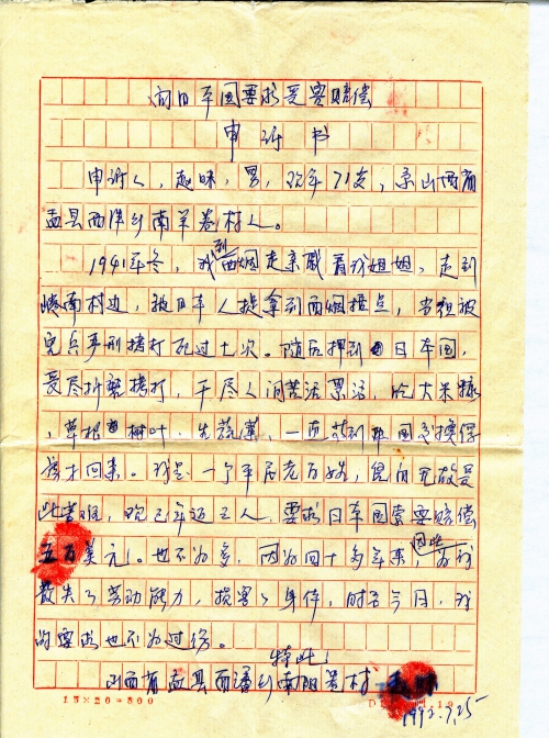 In the winter of 1941, I went to Xiyan to visit my elder sister and when I walked to Lingnan Village, I was captured by the Japanese and sent to their Xiyan base. At the night of that day, I was brutally beaten by the Japanese soldiers and blacked out seven times. Then, I was sent to Japan where I suffered beating and torture. I was forced to do heavy work, eat rice bran, grass roots, tree leaves and raw vegetables until I came back during the exchange of prisoners. I was just a civilian, but endured such suffering without reasons. Now I am old and demand a compensation of 50,000 USD against Japan. I don’t think that’s too much because I was badly injured and lost the ability to work 40 years ago. My request is not too much.