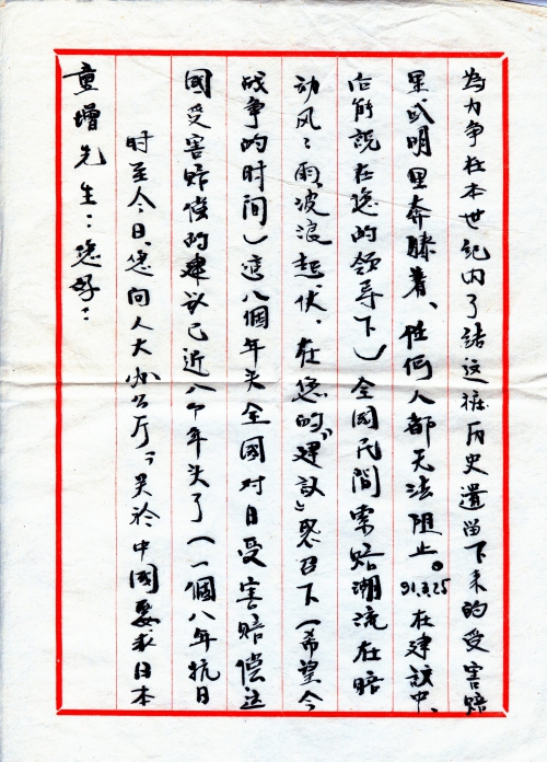 时至今日,您向人大办公厅“关于中国要求日本国受害赔偿”的建议已近八个年头了(一个八年抗日战争的时间)。这八个年头,全国对日受害赔偿运动风风雨、波浪起伏。在您的“建议”感召下(希望今后能说在您的领导下)全国民间索赔潮流在暗里或明里奔腾着,任何人都无法阻止。91.3.25