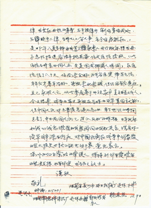 三、受害情况:当日上午九时至下午三时半,日本飞机先后九次七十余架次,对益阳这个小小的市镇进行狂轰滥炸,造成益阳城历史上最大的一次人为灾难。我的全家是当天最后一次轰炸中遭难的。当时我家在建科里开一个小百货商店,那时我还是个刚六周岁的小孩,据母亲说是个本小利微的小商店,全部资金大约是五百块银洋。我记忆中的印象也不过如此,在当次轰炸中,不幸前房中弹起火,室内家具商品基本毁灭。我的父亲向室外奔跑时遭机枪扫射,连中数十弹,当晚我的舅父家来人收尸时只能从残存的衣着中辨认。我的母亲挽着正在哺乳的弟弟坐在后房内,为防止被炸房屋的断砖碎瓦打着婴儿,躬身护住弟弟,但母亲腰背部中了两弹。我坐在母亲的身旁,右手被弹片割伤穿伤两处,左腿中二弹,当时已不省人事,至今伤痕犹在。是日下午八点多钟,由我舅父家来人用竹板床将我母子急忙抬送益阳市桃花仑信义医院抢救。(此医院当时系外国人办,是美国或挪威人待询)在医院住了八十天,伤尚未全好。为节省医资,带药出院,半年后才基本治好。虽然未死未残,但仍留有后遗症,且已家破人亡,从此寄居养于外祖家中,直至我长大成人。今天想来,战争的罪过虽然在当时的日本军国主义者们,但中国人民对这笔债总是不忘的。半个世纪的时间过去了,中日两国人民已进入友好的时期,日本政府如诚心诚意维护和发展两国的友好关系,理应对侵华战争深有内疚,对中国民间在战争中所蒙受的巨大损失也就不能无动于衷,毫无表示。