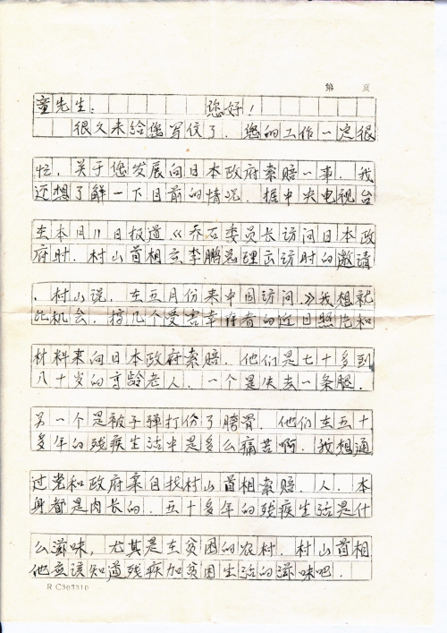 很久未给您写信了,您的工作一定很忙,关于您发展向日本政府索赔一事,我还想了解一下目前的情况。据中央电视台在本月11日报道,《乔石委员长访问日本政府时,村山首相应李鹏总理出访时的邀请,村山说,在五月份来中国访问》。我想就此机会,搞几个受害幸存者的近日照片和材料来向日本政府索赔。他们是七十多到八十岁的高龄老人,一个是失去一条腿,另一个是被子弹打伤了胯骨,他们在五十多年的残疾生活中是多么痛苦啊。我想通过党和政府亲自找村山首相索赔。人本身都是肉长的,五十多年的残疾生活是什么滋味,尤其是在贫困的农村,村山首相他应该知道残疾加贫困生活的滋味吧。
