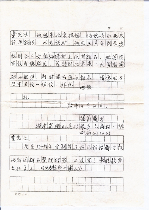 童先生,我想来北京找您,请您告知北京行车路线,以免误时。我在三月份到长沙找到今日文报编辑部主任周辉玉,她要我写信与您联系,我想到北京来一定要有成功的把握。到时候听您的指示,请您在万忙中回我一份信,拜托。