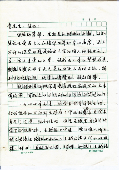 因孤陋寡闻,辗转见到湖南妇女报,得知您站在爱国主义和维护世界和平的高度,为千万计的深受日寇侵略者之害的国人伸张正义。这一令人尊崇的义举,使我几十年的梦想成真,告慰父母在天之灵的日子已为时不远。特郑重向您致敬!经费如需赞助,愿效绵薄。