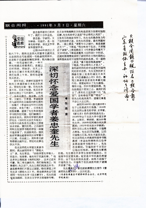 细节:1945年,日本逮捕我(姜厚婨)父亲,一去无回。母亲是画家,父亲被抓时候,母亲的画被日军抢走。信中寄来报刊上的相关报道,作者张寿康,标题“深切怀念爱国学者姜忠奎先生”大概内容如下:1945年正月初六我去向北京西四北弓弦胡同的叔明师(姜忠奎字叔明)拜年发现他被抓,再此之前国学书院的王孝通就被抓了,最终叔明师和五位国学书院的学友被杀。