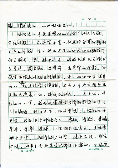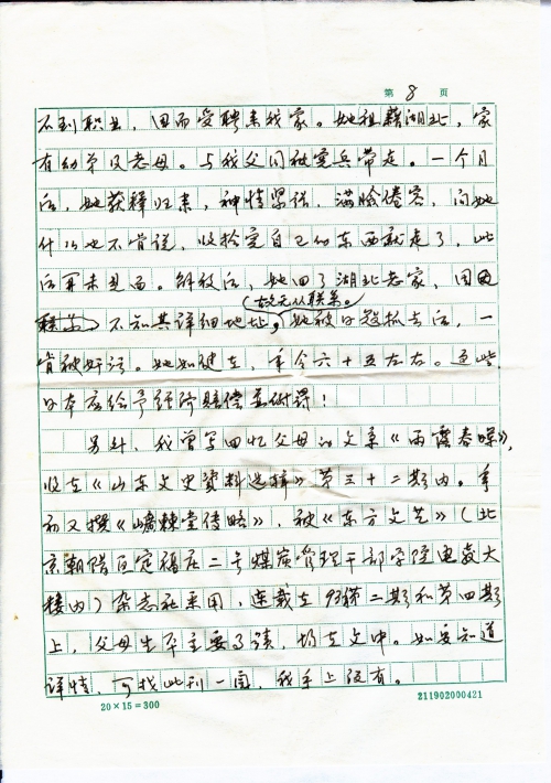另外,我曾写回忆父母的文章《雨露春晖》,收在《山东文史资料选辑》第三十二期内。年初又撰《●●堂传略》,被《东方文艺》(北京朝阳区定福庄二号煤炭管理干部学院电教大楼内)杂志社,连载在93年第二期和第四期上,父母生平主要事迹,均在文中。如要知道详情,可找此刊一阅,我手上没有。