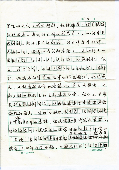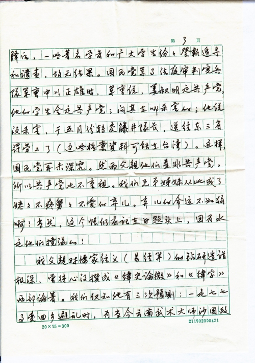 我父亲对儒家经义(易经等)的钻研造诣极深,曾将心得撰成《纬史论微》和《纬学》两部论著。我们仅知他有三次预测:一是七七事变回乡避乱时,为当今云南武术大师沙国政写下四句话:武术超群,环球闻誉;技艺绝伦,到处留名。当时沙大师的武艺平平,此语看来太夸张。然而半个世纪后,沙大师历尽坎坷,九死一生,而那四句话都应验了,为此沙大师感慨尤深。二是一九三九年底,日寇攻占了家乡,居不得宁,父母仍携子女来到北京,临行时,根据各种迹象对后事的作出预决,记述成文,也都准确无误地应验了。第三次预决,也就是被日寇抄去的这部集体合著,估计文中涉及到日寇必将灭亡,中国之未来当属延安等结论性的论断。当时日寇还很凶恶,而国共两党力量对比又那么悬殊,但这论断最终还是应验了。这就是为什么连最发达的国家对我们数千万年前的《易经》要当成谜来研究的原因所在。然而告密者以此利用了日寇,日寇又利用了国民党,最后受害的却成了我们,多么可悲!