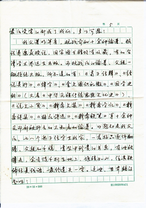 我父著作等身,抗战前的十余种论著,据张寿康教授说,国家图书馆均有收藏,有的台湾学术界还在出版。而抗战后的论著,父亲一概拒绝出版,所知道的有:《荀子注释》、《经说类抄》、《纬学》、《金文图识礼徽》、《国学史纲》(又名《中华民族传统思想文化史》)、《说文小笺》、《韡斋文集》、《韡斋学记》、《韡斋诗集》、《梅花诗选》、《韡斋铁笔》等十余种及那部被抄去的不知名的论著。日寇劫走我父后,七八个鬼子驻守在我家,一应物品逐件翻腾,父亲的手稿,书架中珍贵的书画,有些被掳走,余者随手扔在地上,堆积如山,任其铁蹄往复践踏,最终遗失一空。这些,日本赔得起吗!