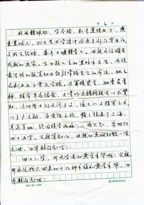 我母钟佩怀,字令瑜,别号蕉阳女子,广东蕉岭人,北大艺术学院中国画专部门毕业后,与我父结婚,斋号《●●堂》。母亲是位颇有成就的画家。在日寇入主的黑暗年月里,为使最可怜的孤哀幼女能够掌握自己的命运,她立志创办女子贫民学校。为筹集资金,她变卖首饰,拼命节衣缩食,大量画作馈赠亲友以求赞助,这些努力仍无济于事,遂又从事殖货之术,以多产之躯,历长阻之路,频频往返于上海、青岛等地,终因积劳成疾,一病不起,卒时仅四十五岁。父亲遭劫后,母亲的画被劫毁一空,这些,日本赔得起吗!
