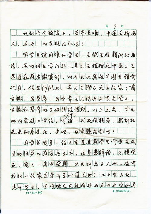 国学书院另一位山东莒县籍学生官荣芸后,同时误落日寇宪兵之手,因身患肺痨,不堪受刑,奄奄一息中获释,不久即离开人世。还有我们一位家庭教师王叶藻(女),二十岁出头,高中毕业,因哑噪及父亲病逝而无力升学和寻不到职业,因而受聘来我家。她祖籍湖北,家有幼弟及老母。与我父同被宪兵带走。一个月后,她获释归来,神情紧张,满脸倦容,问她什么也不肯说,收拾完祖籍的东西就走了,此后再未见面。解放后,她回了湖北老家,因不知其详细地址,故无从联系。她被日寇抓去后,一肯被奸污。她如健在,年龄六十五左右。这些,日本应给予经济赔偿并谢罪!
