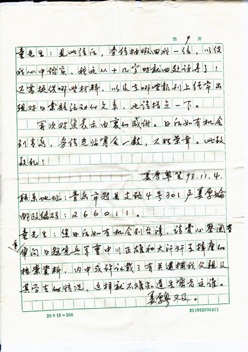 童先生,见此信后,务请抽暇回我一信,以使我心中踏实,我是从十几岁时就四处访寻了!还需提供哪些材料,以及在哪些报刊上经常出现对日索赔活动的文案,也请指点一下。