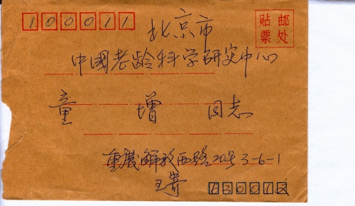 第一次寄北京中国老龄科学研究中心因地址不详被退回来了,现看到“蜀报”1月16日杨力文同志文章后再寄,因急于参加亿人签名活动和向日本驻华使馆交材料事宜,请接信后尽快给予回信谢谢。