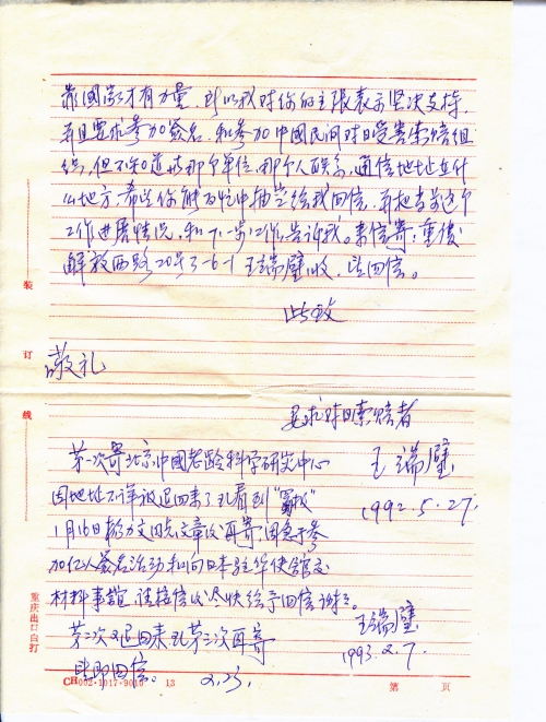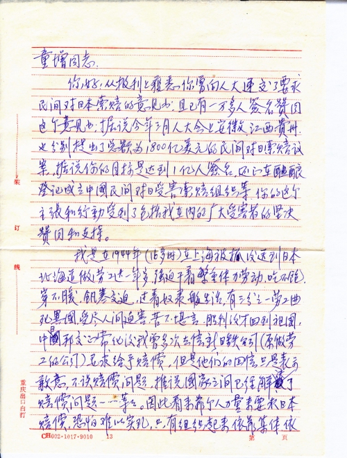 我是在1944年(16岁时)在上海被抓后送到日本北海道做劳工达一年多,强迫干着繁重体力劳动,吃不饱,穿不暖,饥寒交迫,过着奴隶般的生活,有三分之一劳工[屈]死异国,受尽人间迫害,苦不堪言,胜利后才回到祖国,中日邦交正常化后我曾多次去信新日铁公司(原做劳工的公司)要求给予赔偿,但是他们的回信只是表示歉意,不谈赔偿问题,推说国家之间已经解决了赔偿问题……等等。因此看来靠个人力量来要求日本赔偿恐怕难以实现,只有组织起来,依靠集体,依靠国家才有力量,所以我对你的主张表示坚决支持,并且要求参加签名,和参加中国民间对日受害索赔组织,但不知道与[哪]个单位,[哪]个人联系,通信地址在什么地方,希望你能百忙中抽空给我回信,并把当前这个工作进展情况,和下一步工作告诉我。来信寄:重庆解放西路20号3-6-1王瑞壁收,望回信。