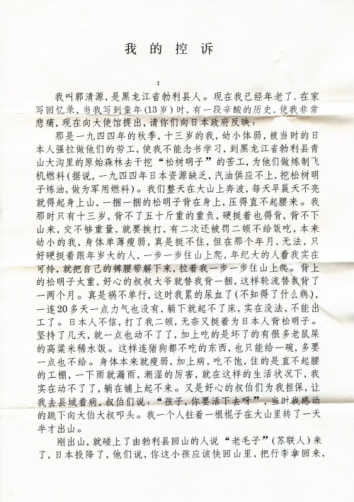我叫郭清源,是黑龙江省勃利县人。现在我已经年老了,在家写回忆录,当我写到童年(13岁)时,有一段辛酸的历史,使我非常悲痛,现在向大使馆提出,请你们向日本政府反映: